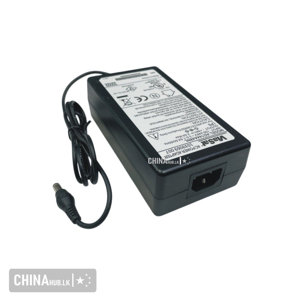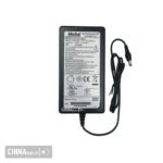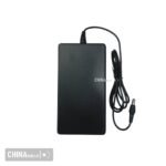 5.5mm x 2.5mm output jack, which is often compatible with the 5.5mm x 2.1mm size, with the center pin being positive (+) and the outer barrel negative (-).
