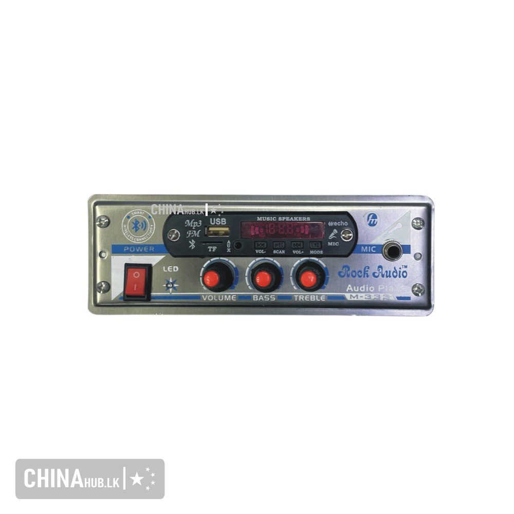 Includes inputs for Bluetooth, USB, FM Radio, AUX, and a microphone (MIC).